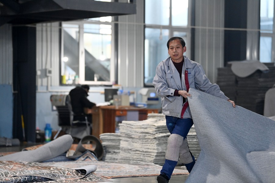 在天津市武清区崔黄口镇凯利地毯有限公司,工人搬运地毯(2月1日摄)。新华社记者 李然 摄