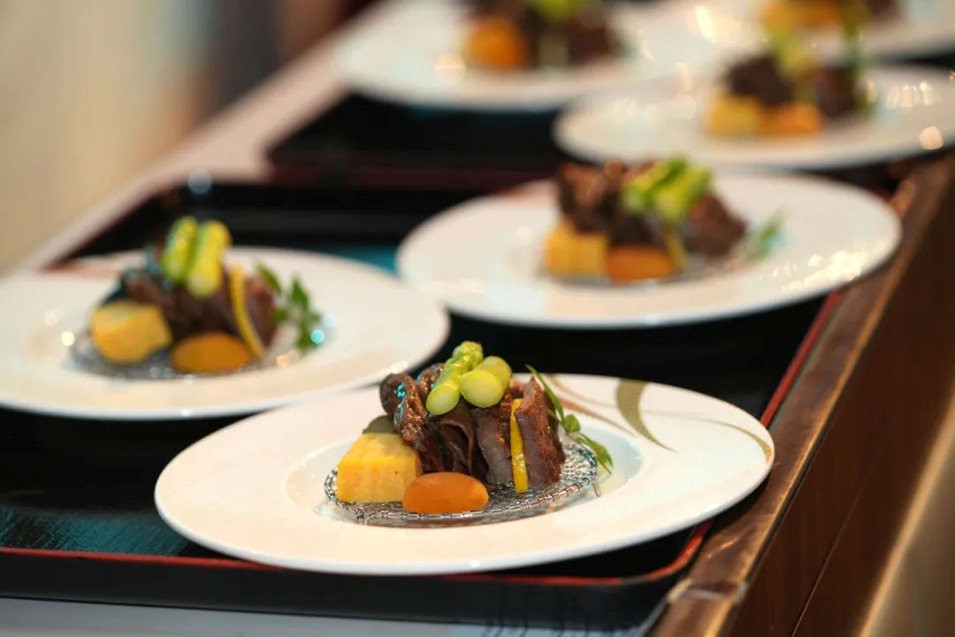 “日本代表性的黑毛和牛肉被特制的茅台调味酱酱汁锁住甘醇原味,冷涮肉的酱味与茅台酒的酱香融为一体;牛舌用十年以上的橘皮去腥后口感清爽,与精品茅台独有的焦香结合,让独特的美味在口腔里迸发。”