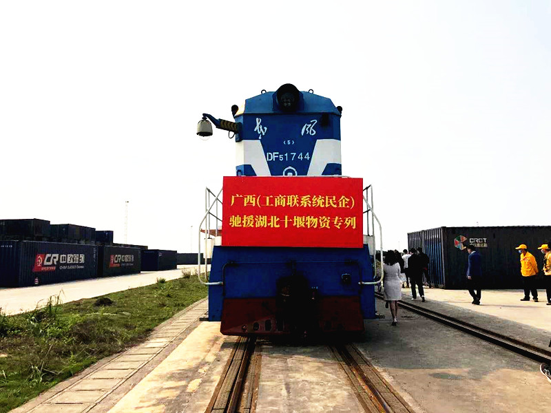 3月10日下午,满载着广西壮族自治区工商联系统民营企业爱心的广西支援湖北物资直达冷链专列从南宁铁路国际港出发,直发对口支援湖北十堰市。这是广西开出的第十二班支援湖北物资直达冷链专列,也是第五班对口支援湖北十堰市的专列。此班专列是广西工商联系统民营企业对口支援十堰的专列,所载物资包括生活物资和医疗防护物资,均由广西区工商联组织全区工商联系统、民营企业家捐赠。广西壮族自治区政协副主席、工商联主席磨长英,自治区党委统战部副部长、工商联党组书记熊春寒,自治区商务厅副厅长粟坚以及各爱心民企、商会代表等出席发车仪式。